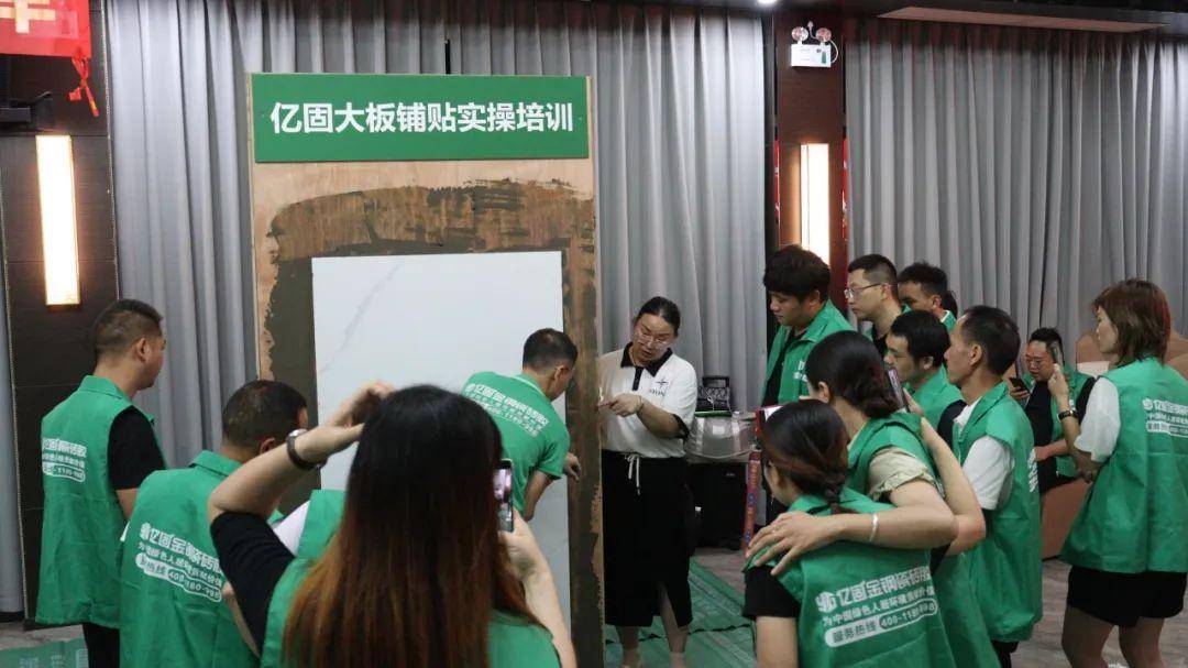 為幫助新晉經銷商進一步搶占市場,2023億固集團·首席品牌官特訓營還舉辦一場隆重的鋪貼大賽,在億固大板巖板落地交付首席培訓師團隊的帶領下,四個經銷商團隊分組進行大板鋪貼實操。