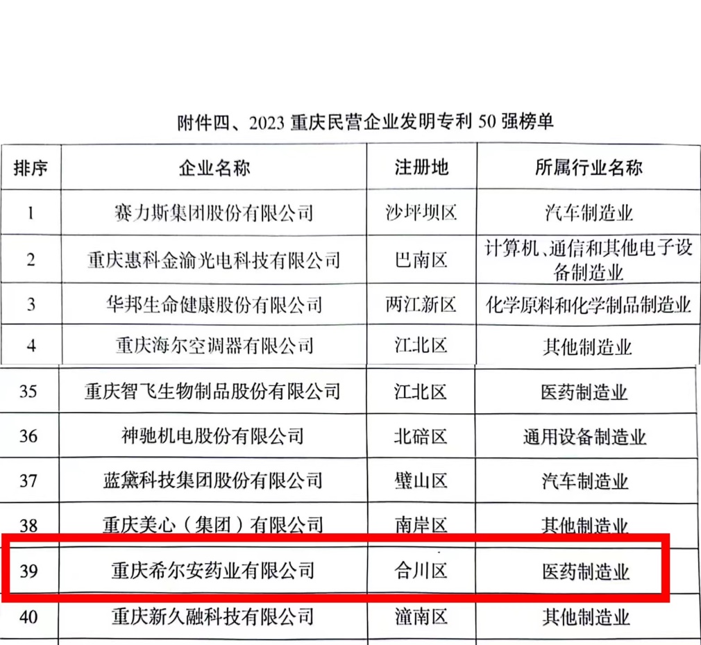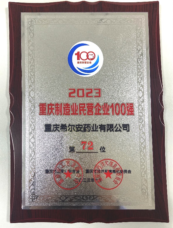 2023年10月17日,重慶市工商業(yè)聯(lián)合會、市科學技術局、市經(jīng)濟和信息化委員會聯(lián)合舉辦2023重慶民營企業(yè)100強發(fā)布會,會上發(fā)布了多個榜單排名。重慶希爾安藥業(yè)有限公司(簡稱希爾安藥業(yè))榮登2023制造業(yè)民營企業(yè)100強榜第72名,2023重慶民營企業(yè)科技創(chuàng)新指數(shù)100強榜第28名,以及科技創(chuàng)新指數(shù)100強榜首次發(fā)布的“2023重慶民營企業(yè)發(fā)明專利50強”專項子榜單第39名。