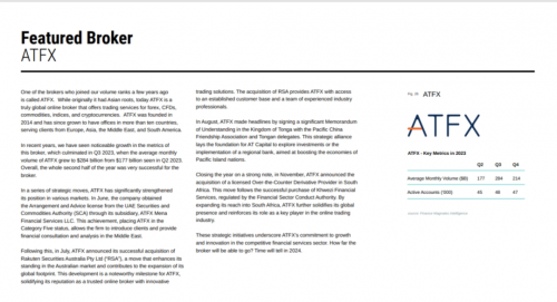 回首上個季度,ATFX以8523億美元的總交易量,同比增長88.15%的卓越業(yè)績位居全球第四。此次四季度交易量雖略有下滑,但全球排名依然穩(wěn)固,這在復(fù)雜多變的世界經(jīng)濟環(huán)境下顯得難能可貴。得益于全球業(yè)務(wù)擴張和全面鋪開的市場營銷策略,ATFX品牌聲譽有了顯著提升,本季度內(nèi)ATFX網(wǎng)站排名和訪問量有了突破性進展。數(shù)據(jù)顯示,ATFX全球官網(wǎng)在行業(yè)內(nèi)的排名位居前四,第四季度的官網(wǎng)訪問量更是達到了驚人的1590萬人次。此外,F(xiàn)inance Magnates還用一整個版面來報道引薦ATFX,我們更是被評為當前行業(yè)中“值得推薦的在線經(jīng)紀商”。這是行業(yè)權(quán) 威媒體對一家實力聲譽俱佳的經(jīng)紀商2023年業(yè)績與市場表現(xiàn)的重量級認可。