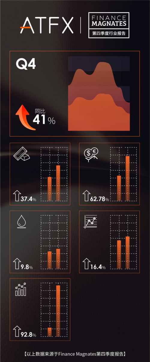 報告顯示,2023年第四季度我司整體業(yè)績表現(xiàn)穩(wěn)健且持續(xù)上升,其中,多項主營業(yè)務(wù)成交量呈現(xiàn)兩位數(shù)激增,充分展示了我司在行業(yè)內(nèi)的競爭優(yōu)勢和不斷創(chuàng)新的能力。具體數(shù)據(jù)方面,與去年同期相比,本季度ATFX交易量和交易活躍人數(shù)也有了明顯增長,其中MT4/MT5交易量同比增長41%,活躍人數(shù)同比增長1.81%,多個類別衍生產(chǎn)品交易量更有高達兩位數(shù)的增長: