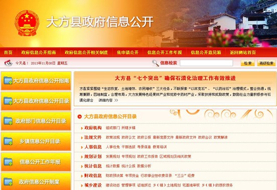 貴州省大方縣政府門戶網(wǎng)站群,以縣政府門戶網(wǎng)站“中國貴州—大方政務(wù)門戶網(wǎng)”為主站。出臺了《關(guān)于進一步加強縣政府門戶網(wǎng)站群建設(shè)工作的通知》文件,就如何加強政府門戶網(wǎng)站群管理作出具體的可操作性的規(guī)定。網(wǎng)站群集34個鄉(xiāng)鎮(zhèn)子網(wǎng)站和40個部門子網(wǎng)站為一休,統(tǒng)一對外發(fā)布政府信息,成為大方縣電子政務(wù)應(yīng)用的重要組成部分以及政府信息公開的主要載體和平臺。政府網(wǎng)站群的建設(shè)標(biāo)志著大方縣電子政務(wù)建設(shè)的重心發(fā)生轉(zhuǎn)移,由局部建設(shè)轉(zhuǎn)向整合建設(shè),由分散、自發(fā)建設(shè)轉(zhuǎn)向集約化統(tǒng)籌建設(shè),為政府網(wǎng)站實現(xiàn)深層次、跨部門的信息整合和資源開發(fā)利用打下基礎(chǔ)。