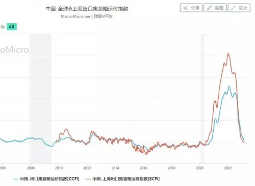 港口堆積成山,主要是因?yàn)樵谝咔槌跗谌肆Α⑦\(yùn)輸、集裝箱等各方面資源緊缺,價(jià)格暴漲就導(dǎo)致供應(yīng)大量增加,集裝箱生產(chǎn)超平時(shí)的三倍,所以產(chǎn)能過剩、運(yùn)價(jià)暴漲等的情況出現(xiàn)也在意料之內(nèi)。從中國-全球&上海出口集裝箱運(yùn)價(jià)指數(shù)表內(nèi)就可以看到,自2022年開始,集裝箱的運(yùn)價(jià)就在垂直下降。