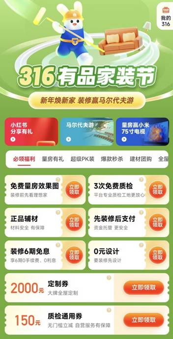 所有有裝修意向的用戶都可以登錄土巴兔APP或小程序進(jìn)入家裝節(jié)頁面,點(diǎn)擊領(lǐng)取包含特色保障服務(wù)在內(nèi)的量房送效果圖、0元設(shè)計(jì)等必領(lǐng)福利,以及2000元大牌全屋定制優(yōu)惠券和150元無門檻質(zhì)檢通用劵。