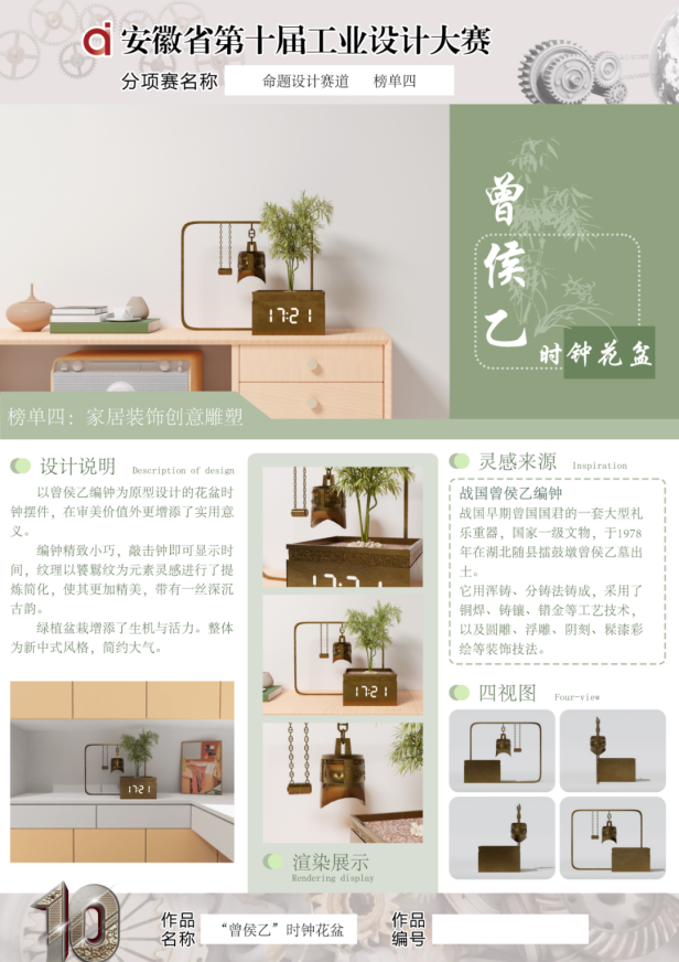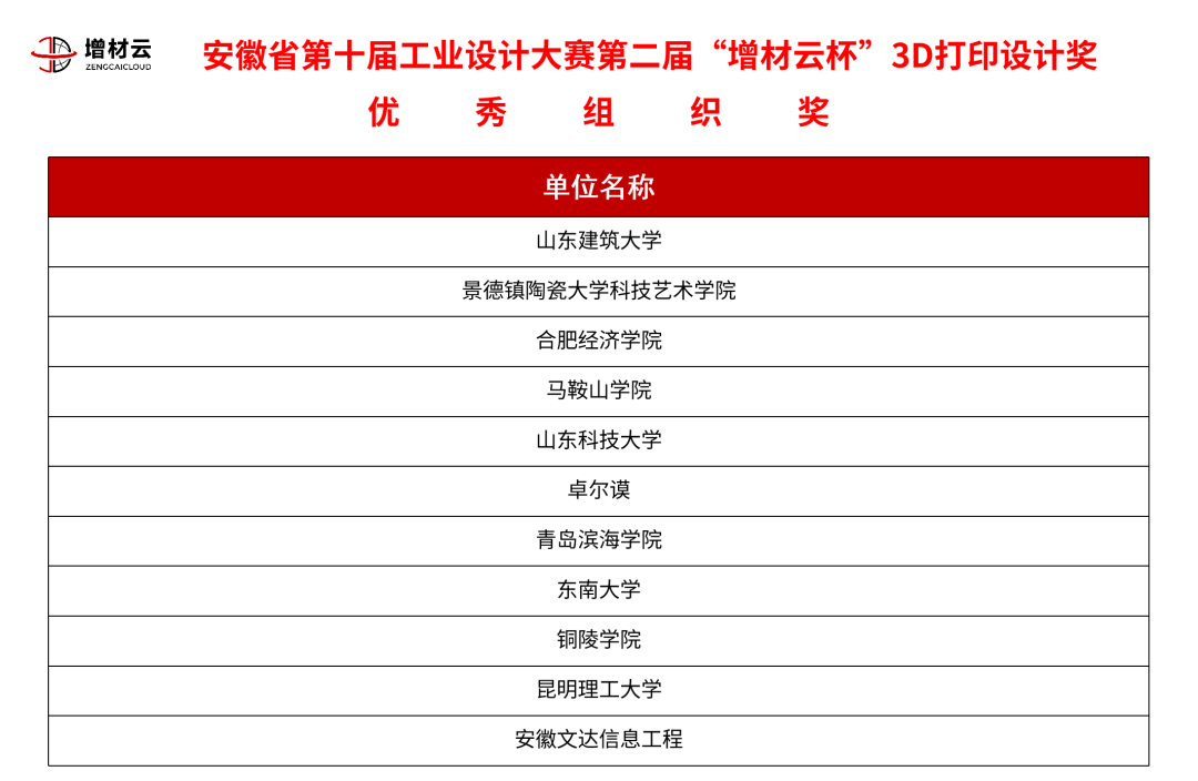 活動(dòng)的最后大家進(jìn)行了合影留念。安徽經(jīng)濟(jì)報(bào)社和增材云視頻號同步進(jìn)行了線上直播,吸引了許多工業(yè)設(shè)計(jì)師、相關(guān)行業(yè)從業(yè)人員、3D打印愛好者進(jìn)入直播間,在線上“圍觀”了本次賽事。瀏覽量超10萬人次。本次安徽省第十屆工業(yè)設(shè)計(jì)大賽第二屆“增材云杯”3D打印設(shè)計(jì)獎(jiǎng)分項(xiàng)賽,獲獎(jiǎng)作品共計(jì)68件,優(yōu)秀指導(dǎo)老師10名,優(yōu)秀組織獎(jiǎng)11名。其中《“曾侯乙”時(shí)鐘花盆擺件》,曼界設(shè)計(jì)的《花舞》等4件作品獲得了一等獎(jiǎng),《spooort運(yùn)動(dòng)水壺》、《東壺茶具》、《山水樓臺(tái)明月燈》等15件作品獲二等獎(jiǎng),《旭日東升》、《提醒泡泡貼》等49件作品獲三等獎(jiǎng)。具體獲獎(jiǎng)名單見下方表格。