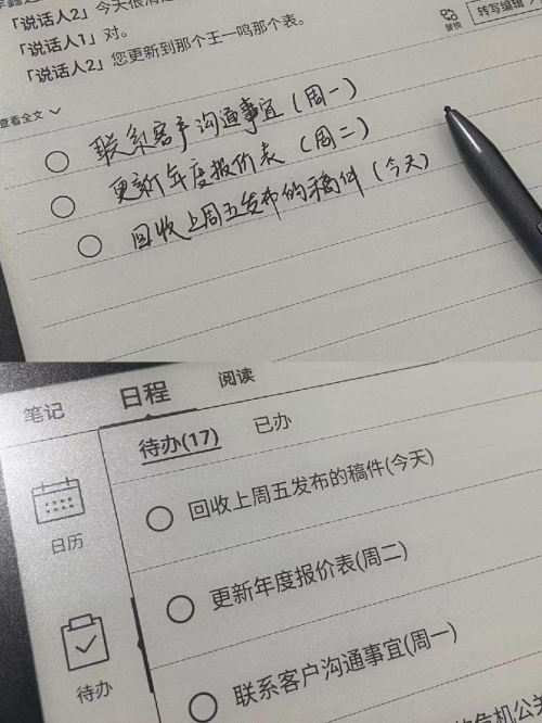 在做會議記錄時,我們的手也不會閑著,遇到重點議題,可以用配套的Wacom電磁筆在屏幕下半部分的單行線上記錄下來,并在前面畫上圈圈或者星星。訊飛智能辦公本X3就會自動幫我們把議題規(guī)整記錄到日程表上。會后我們只需要看看日程,就能夠知道下一步的行動。