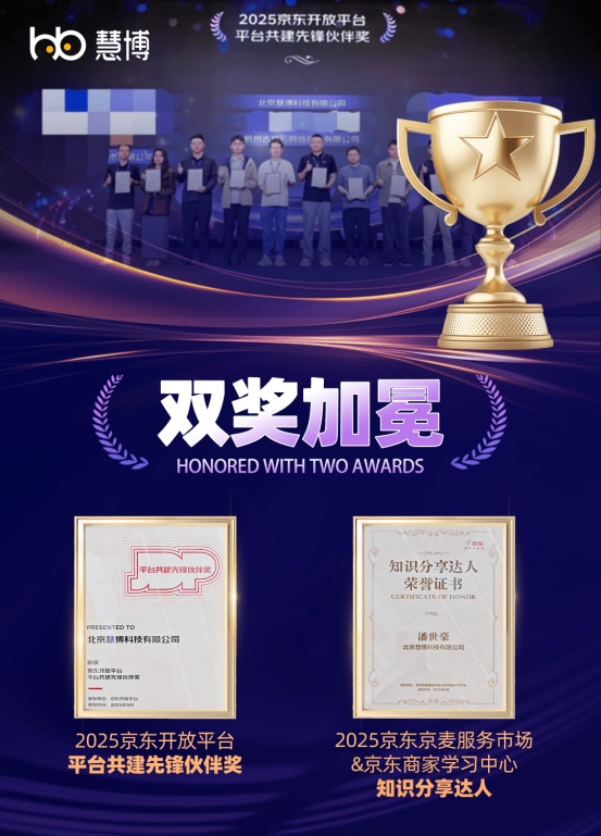慧博科技自成立以來(lái),便與京東官方保持深度合作,從產(chǎn)品共創(chuàng)到運(yùn)營(yíng)策略共建,始終緊跟京東生態(tài)發(fā)展步伐,深度融入平臺(tái)商家服務(wù)體系。憑借扎實(shí)的技術(shù)與服務(wù)能力,慧博已連續(xù)5年蟬聯(lián)京東"京卓越"優(yōu)秀服務(wù)商獎(jiǎng),在今年10月京東服務(wù)商開(kāi)放季交流會(huì)上,更一舉斬獲"平臺(tái)共建先鋒伙伴獎(jiǎng)"與"知識(shí)分享達(dá)人"雙項(xiàng)大獎(jiǎng)——這既是京東對(duì)雙方合作的高度認(rèn)可,更印證了集客CRM的硬核實(shí)力。