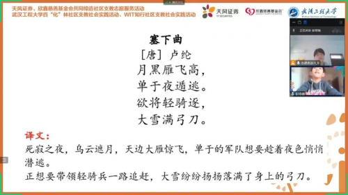 在共青團(tuán)武昌區(qū)委的組織下,天風(fēng)證券的志愿服務(wù)團(tuán)隊(duì)和武漢市某街道一對(duì)一,開啟了走進(jìn)社區(qū)進(jìn)行支教的志愿者活動(dòng)。在開展志愿者活動(dòng)之前,天風(fēng)證券先派人了解了該社區(qū)群眾的需求。當(dāng)時(shí)正值寒假期間,該校區(qū)的群眾對(duì)于寒假期間能夠給在家的小孩子進(jìn)行課業(yè)輔導(dǎo)有著比較大的需求。了解到社區(qū)居民們的這一需求以后,天風(fēng)證券的黨員青年志愿服務(wù)隊(duì)就聯(lián)合武漢工程大學(xué)志愿服務(wù)隊(duì)的青年志愿者們,開展了一個(gè)為期兩個(gè)月的線上課程與輔導(dǎo)活動(dòng)。這樣一個(gè)為期兩個(gè)月的公益活動(dòng),不僅解決了該社區(qū)居民們所遇到的實(shí)實(shí)在在的問(wèn)題,還提升了社區(qū)居民的幸福感,在寒冷的冬天為社區(qū)居民創(chuàng)建了一個(gè)美好的生活。