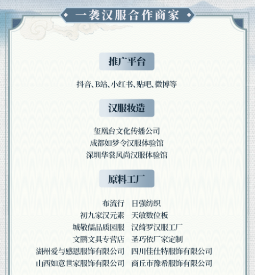 此外,一襲漢服課堂還和來兮如云、泮林PANLIN、仲瀾卿漢定制工坊、成都清歡記服裝設(shè)計(jì)有限公司、華坊記等數(shù)十家漢服商家達(dá)成合作。這些都是目前漢服市場上備受好評的漢服商家,對于設(shè)計(jì)稿的需求量也比較大。學(xué)員們可以直接把漢服設(shè)計(jì)稿對接給漢服商家審核。