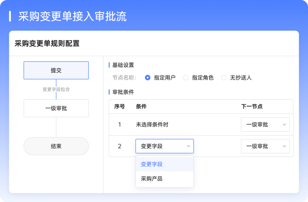 采購變更單接入審批流,支持賣家自定義審批條件與審批人員層級,采購變更管理更靈活。