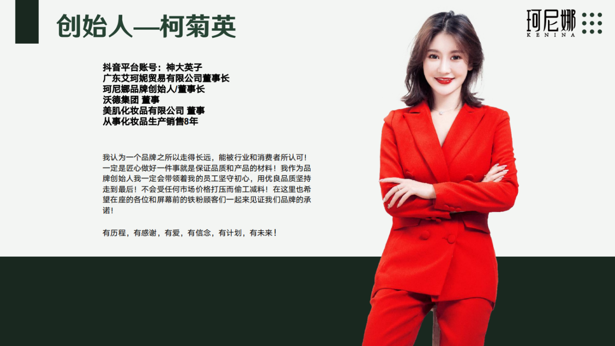 珂尼娜是專注為亞洲皮膚定制的植物護(hù)膚品牌,因其一流的研發(fā)團(tuán)隊(duì),專業(yè)且新穎的研發(fā)制造技術(shù),一經(jīng)面世就受到廣大消費(fèi)者的好評(píng)與復(fù)購。其創(chuàng)始人柯菊英通過抖音號(hào):神大英子,向大家普及科學(xué)的植物養(yǎng)膚的方法,解決了許多消費(fèi)者的皮膚問題。