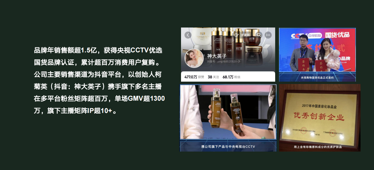 品牌年銷額超1.5億,獲CCTV優(yōu)選國貨品牌認(rèn)證,累計(jì)超百萬消費(fèi)用戶復(fù)購,公司主要銷售渠道為抖音平臺(tái),以創(chuàng)始人柯菊英(抖音號(hào):神大英子)攜手旗下多名主播,擁有超百萬的粉絲矩陣,其單場(chǎng)GMV超1500萬,旗下粉絲矩陣超10+。