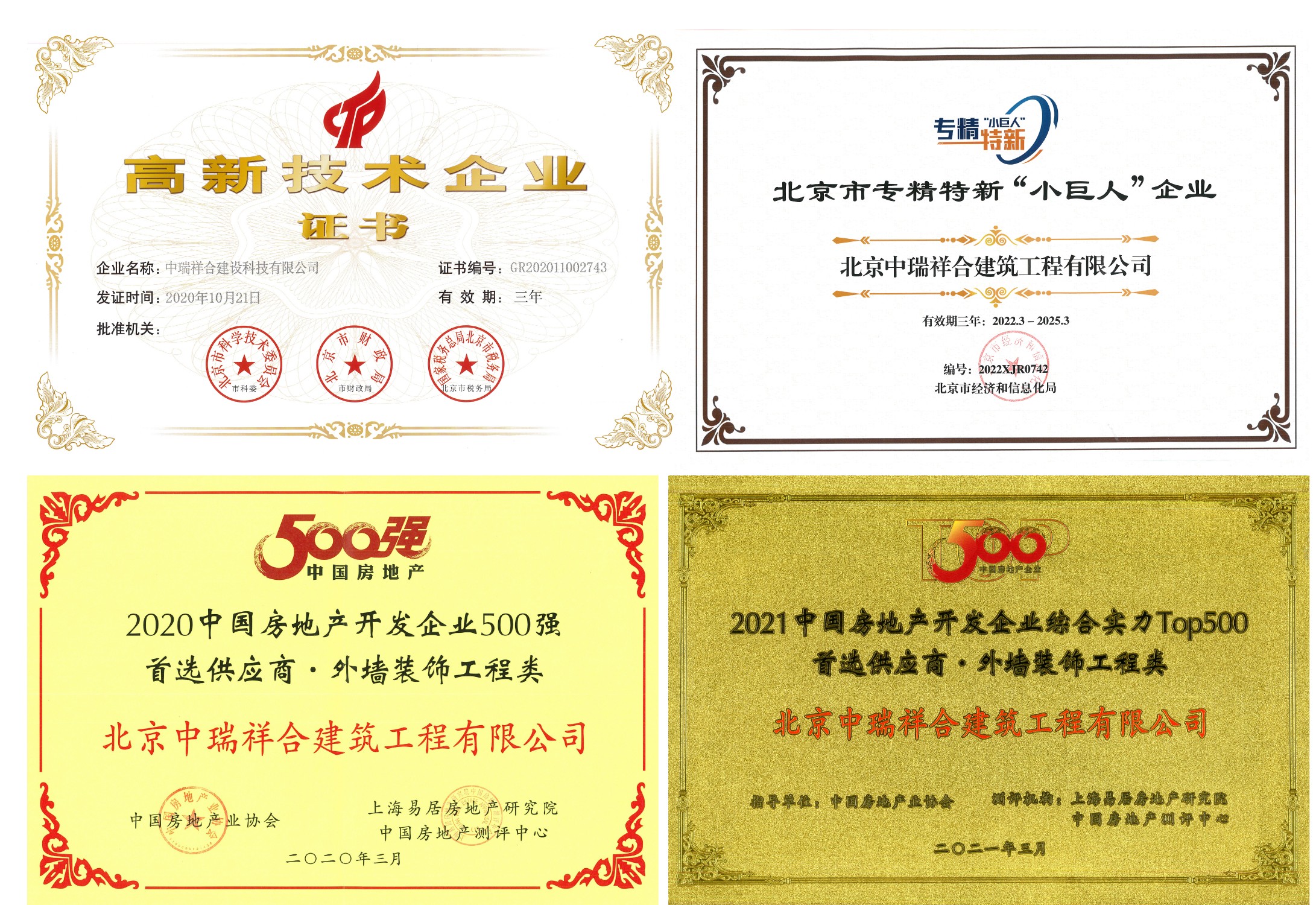 中瑞祥合建設(shè)科技有限公司(原名:北京中瑞祥合建筑工程有限公司 以下簡稱:中瑞祥合)始創(chuàng)于2012年3月1日,是行業(yè)內(nèi)專業(yè)從事建筑裝飾及深化設(shè)計一體化施工以及勞務(wù)輸出為主體的工程服務(wù)商。主營業(yè)務(wù)分為“外墻節(jié)能裝飾系統(tǒng)”、“屋面、防水系統(tǒng)”、“建筑幕墻系統(tǒng)”、“建筑地坪系統(tǒng)”及“室內(nèi)裝飾系統(tǒng)”五大定 位,具有建筑工程施工總承包叁級、防水防腐保溫工程專業(yè)承包壹級、建筑裝修裝飾工程專業(yè)承包壹級、建筑幕墻工程專業(yè)承包責貳級、建筑裝飾工程設(shè)計專項乙級資質(zhì)、施工勞務(wù)等資質(zhì),于2017年被授予國家高新技術(shù)企業(yè)及中關(guān)村高新技術(shù)企業(yè),多次榮獲中國房地產(chǎn)開發(fā)企業(yè)500強首選供應(yīng)商·外墻裝飾工程類,2022年榮獲北京市專精特新“小巨人”企業(yè)等品牌榮譽。2023年獲得《品牌中國》欄目重點推薦品牌的榮譽。