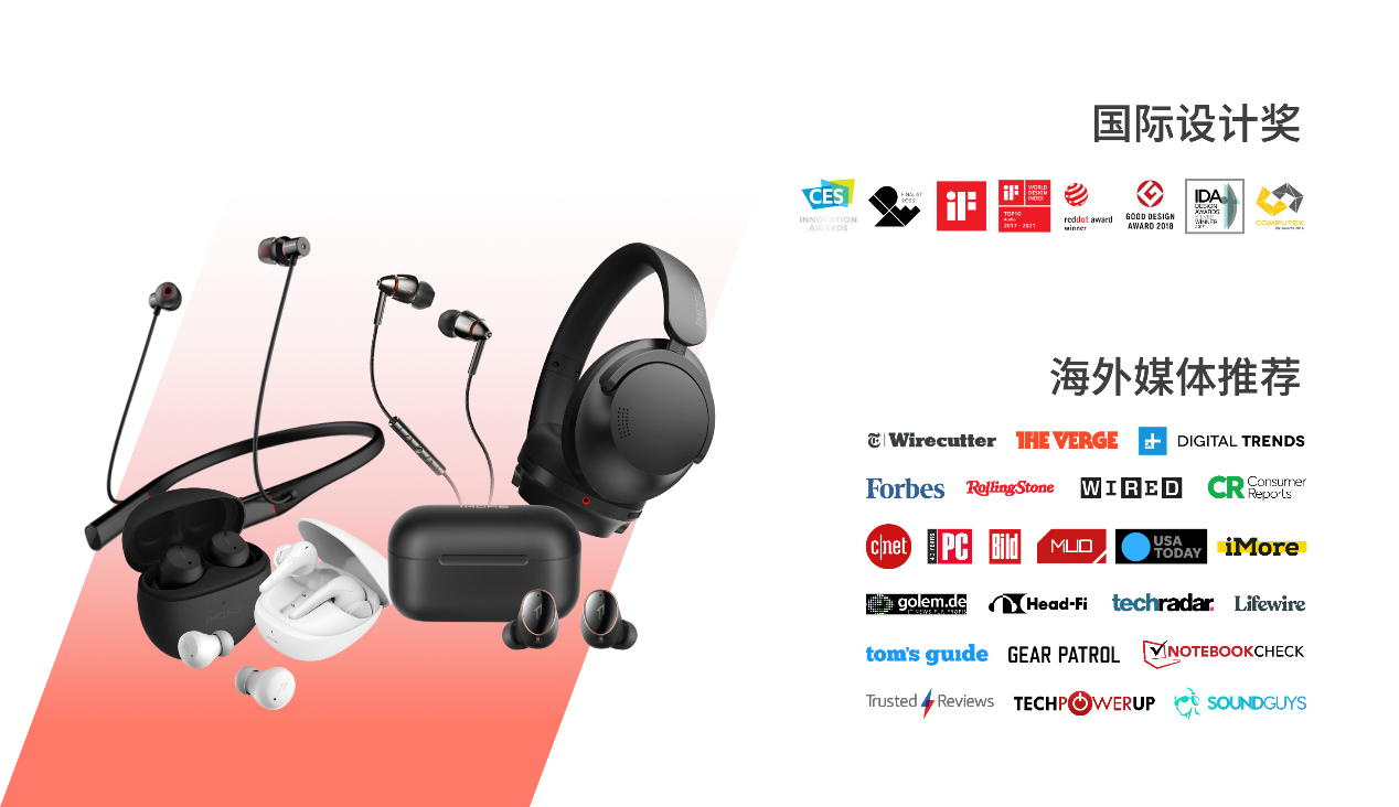 1MORE萬魔耳機專注專業(yè)聲學(xué)與智能軟硬件的研發(fā),自2013年品牌成立以來,累積的授權(quán)專利達330件,斬獲國際四大權(quán)威設(shè)計獎共 40 項(包括德國 iF 設(shè)計獎、德國紅點設(shè)計獎、美國 IDEA 設(shè)計獎、日本G-Mark優(yōu)良設(shè)計獎),連續(xù) 4 年 12 款產(chǎn)品獲得美國 CES 創(chuàng)新設(shè)計獎,多款產(chǎn)品獲得 EHA(歐洲硬件協(xié)會)“年度最 佳耳機獎”,美國知名權(quán)威媒體《消費者報告》亦將其 2 款產(chǎn)品列為全球耳機類 186 個名牌競品中的第 一名、第二名向消費者重點推薦。眾多來自行業(yè)機構(gòu)、權(quán) 威雜志、評測網(wǎng)站和消費者的認(rèn)可,既是對萬魔耳機過往的肯定,也是萬魔耳機不斷科技創(chuàng)新的動力。