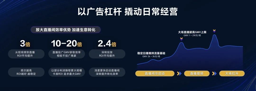 在此基礎(chǔ)上,適時(shí)利用巨量引擎的廣告投放就可以撬動(dòng)更多流量,讓經(jīng)營(yíng)更上一層樓。商家進(jìn)行直播加熱后,GMV的獲取效率可以提升10-20倍,通過廣告撬動(dòng)日常經(jīng)營(yíng)的杠桿作用可見一斑。