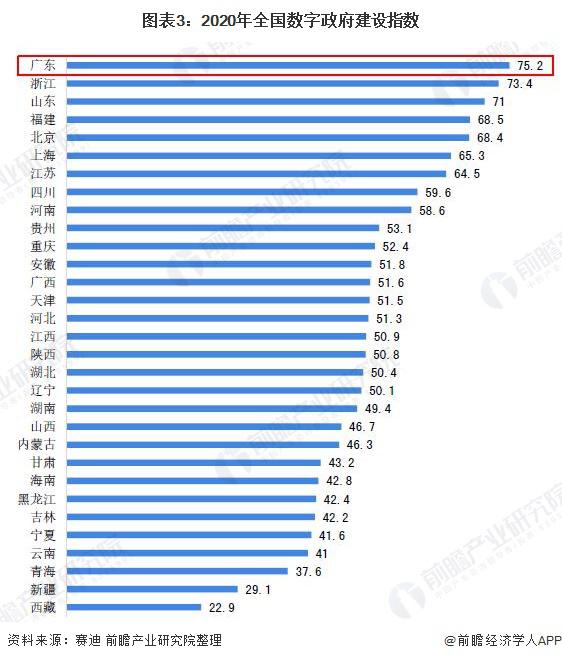 根據(jù)賽迪顧問發(fā)布的《2020 中國數(shù)字政府建設(shè)白皮書》顯示,2020 年全國數(shù)字政府建設(shè)指數(shù)排名前 10 位分別是廣東、浙江、山東、福建、北京、上海、江蘇、四川、河南和貴州。廣東省數(shù)字政府建設(shè)指數(shù)為 75.2,排名全國第 1。