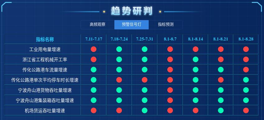 三是預(yù)警更直觀:智能分析高頻數(shù)據(jù)周增速環(huán)比變化情況,以紅、藍(lán)、綠三色信號(hào)燈形式展示經(jīng)濟(jì)運(yùn)行情況,及時(shí)發(fā)現(xiàn)經(jīng)濟(jì)運(yùn)行苗頭性、傾向性、趨勢性問題。