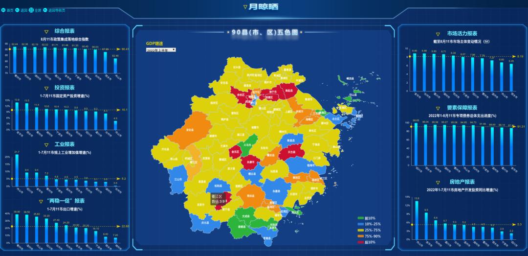 四是晾曬更有效:圍繞浙江穩(wěn)進(jìn)提質(zhì)八大攻堅(jiān)行動(dòng),構(gòu)建指標(biāo)體系,共7張報(bào)表28項(xiàng)指標(biāo),每月以柱狀圖和“五色圖”綜合晾曬全省11市、90縣(市、區(qū)),便于各地查漏補(bǔ)缺,推動(dòng)全省形成爭先創(chuàng)優(yōu)的氛圍。
