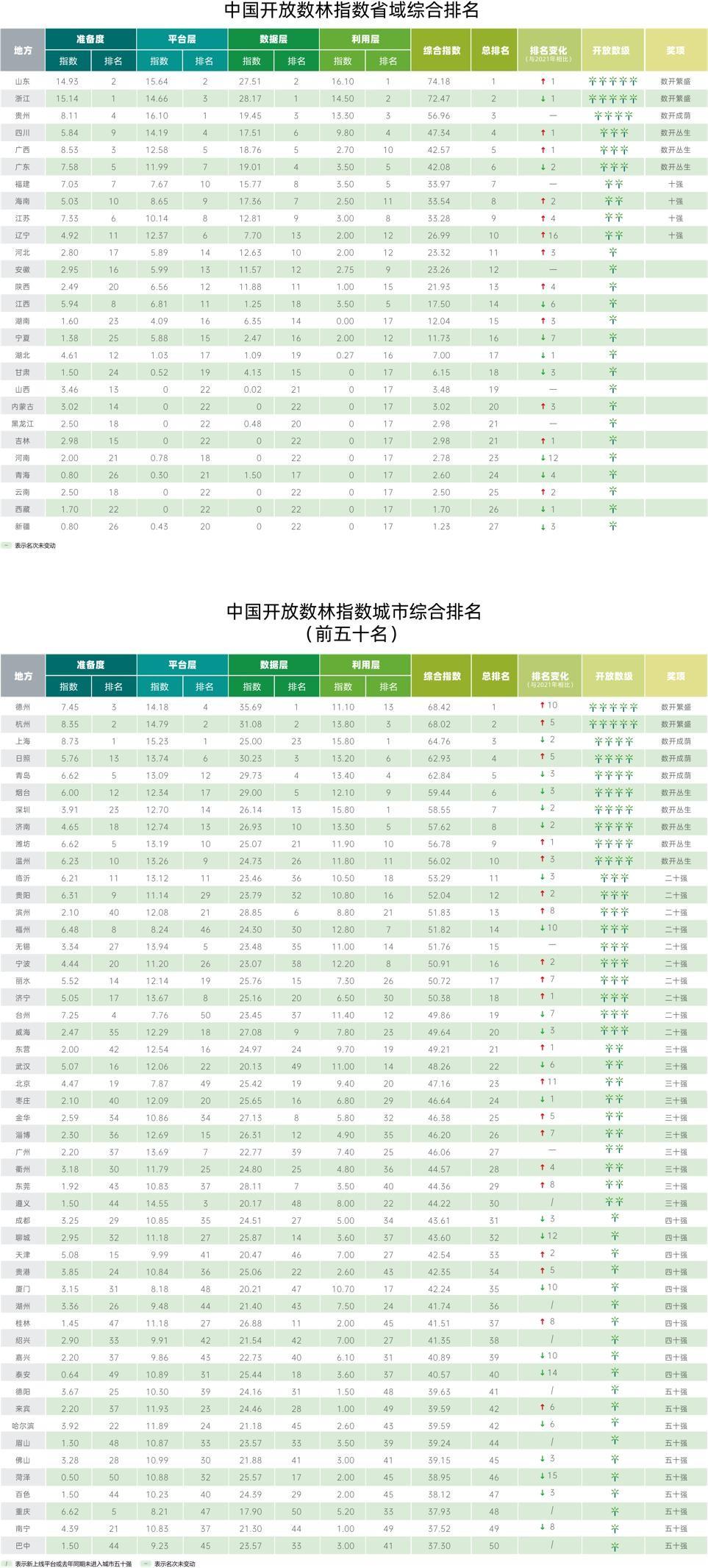 報告展示了2022年度全國省域開放數(shù)林的指數(shù)分值、排名和等級。山東省和浙江省的綜合表現(xiàn)最優(yōu),獲得省域“數(shù)開繁盛”大獎;貴州省也總體表現(xiàn)優(yōu)秀,獲得省域“數(shù)開成蔭”獎。在四個單項維度上,山東省在利用層位列第一,浙江省在準備度和數(shù)據(jù)層位列第一,貴州省在平臺層位列第一。
