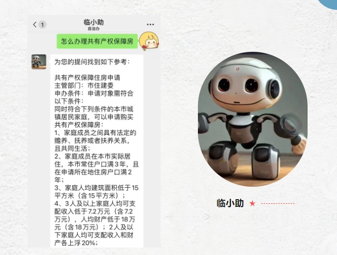 居民區(qū)一線需要的數(shù)據(jù)超過(guò)50%來(lái)自業(yè)務(wù)系統(tǒng),彭浦新村街道將相關(guān)政務(wù)數(shù)據(jù)歸集到區(qū)政務(wù)數(shù)據(jù)共享平臺(tái),確定了“街道提出申請(qǐng)、區(qū)數(shù)據(jù)管理部門(mén)審核、業(yè)務(wù)數(shù)據(jù)提供方供應(yīng)數(shù)據(jù)”的模式。臨汾路街道推出了ai對(duì)話機(jī)器人“臨小助”,收錄了公安、民政、人社、房管等15個(gè)部門(mén)198項(xiàng)面向居民的服務(wù)類政策。以居民查詢?nèi)绾紊暾?qǐng)共有產(chǎn)權(quán)保障房為例,居民區(qū)社工現(xiàn)在只需拿出手機(jī),在微信中找到ai對(duì)話機(jī)器人“臨小助”,輸入“怎么辦理共有產(chǎn)權(quán)保障房”,一秒鐘就得到了經(jīng)過(guò)整理?xiàng)l理清晰的答案。