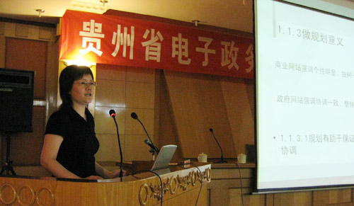 培訓會上,鄭愛軍女士從“政府網(wǎng)站的規(guī)劃與案例分析”、“政府網(wǎng)站的評測與指標分析”和“服務性政府網(wǎng)站的特征與構(gòu)建技巧”三個方面對政府網(wǎng)站的建設(shè)進行了全面解讀,并抽取了貴州省內(nèi)部分典型的政府網(wǎng)站進行了現(xiàn)場點評,從基礎(chǔ)理論聯(lián)系到實際情況,內(nèi)容深淺適中,說服力強。會后,鄭愛軍女士會同相關(guān)專家與參會學員們在電子政務建設(shè)過程中所遇到的困惑、解決方法和理論探討等方面進行了互動交流。