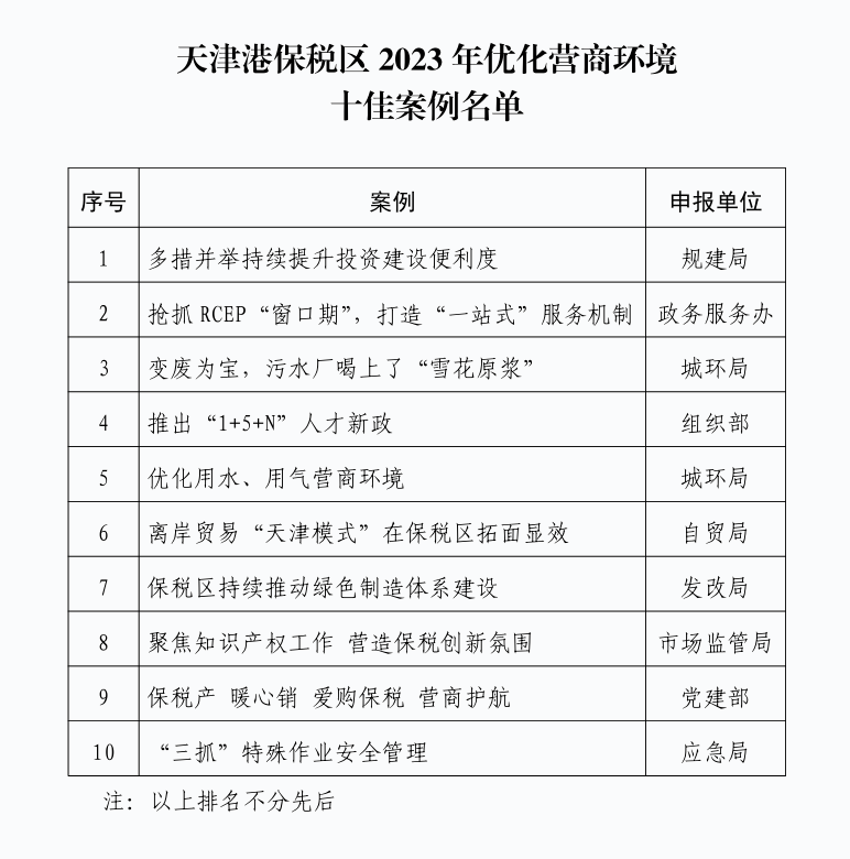 2023年天津港保稅區(qū)堅(jiān)持深入貫徹黨中央、國(guó)務(wù)院關(guān)于優(yōu)化營(yíng)商環(huán)境工作的重要部署,落實(shí)市委市政府“十項(xiàng)行動(dòng)”工作要求、濱海新區(qū)高質(zhì)量發(fā)展支撐引領(lǐng)行動(dòng)方案,對(duì)標(biāo)國(guó)際高標(biāo)準(zhǔn)經(jīng)貿(mào)規(guī)則,進(jìn)一步激發(fā)市場(chǎng)活力,加快打造市場(chǎng)化、法治化、國(guó)際化的營(yíng)商環(huán)境高地,充分釋放營(yíng)商環(huán)境改革的“生產(chǎn)力效應(yīng)”。