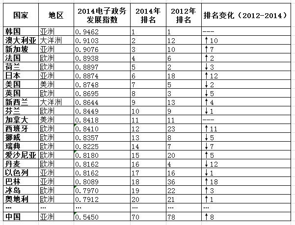報(bào)告顯示,韓國(guó)以0.9462的總分高居全球電子政務(wù)發(fā)展排行榜的首位,名列第二至十位的是澳大利亞、新加坡、法國(guó)、荷蘭、日本、美國(guó)、英國(guó)、新西蘭、芬蘭。中國(guó)以0.5450的總分排名70位,比2012年上升了8位。