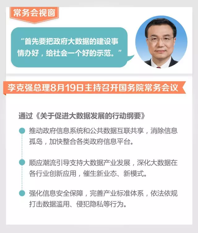8月19日常務(wù)會的議題之一,是討論研究《關(guān)于促進(jìn)大數(shù)據(jù)發(fā)展的行動綱要》。李克強總理強調(diào),制定大數(shù)據(jù)行動綱要,要突出圍繞“政府大數(shù)據(jù)建設(shè)”和“創(chuàng)造健康發(fā)展的大數(shù)據(jù)環(huán)境”這兩項核心內(nèi)容展開??偫淼闹v話重點凸現(xiàn)了三個“關(guān)鍵詞”。