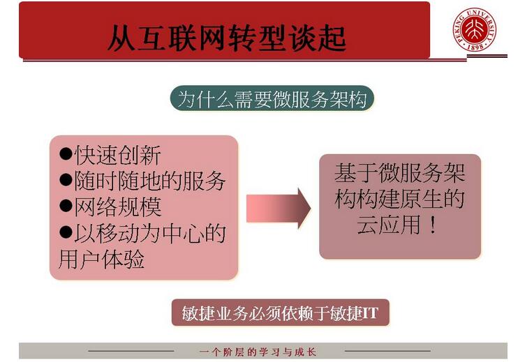 第一,快速的創(chuàng)新。在互聯(lián)網(wǎng)時(shí)代我們需要快速的創(chuàng)新。不像過(guò)去,我們做一個(gè)系統(tǒng)花了很長(zhǎng)時(shí)間,半年甚至一年實(shí)施出來(lái),為時(shí)晚矣。信息時(shí)代,我們需要快速的響應(yīng)和交付。