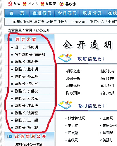 4月23日,網(wǎng)民“冷劍如霜”在論壇的帖文說(shuō),“進(jìn)入中國(guó)石門(mén)政府網(wǎng)站,赫然發(fā)現(xiàn),該縣人民政府領(lǐng)導(dǎo)班子成員配置竟是一正十一副”。他還貼出了石門(mén)縣政府網(wǎng)站所列的領(lǐng)導(dǎo)班子的截圖和各領(lǐng)導(dǎo)具體分工。24日,記者登錄石門(mén)政府網(wǎng),在“政務(wù)公開(kāi)”欄目下,看到該縣領(lǐng)導(dǎo)為縣長(zhǎng)1名,常務(wù)副縣長(zhǎng)1名,副縣長(zhǎng)10名。在該欄目下的子欄目“領(lǐng)導(dǎo)之窗”中,記者又看到縣委常委的名單,共計(jì)16人。