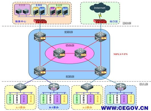 業(yè)務(wù)骨干網(wǎng)采用業(yè)界標(biāo)準(zhǔn)的BGP MPLS VPN技術(shù),將用戶接入?yún)^(qū)域劃分為如下四個(gè)區(qū)域:政務(wù)資源共享區(qū)、互聯(lián)網(wǎng)區(qū)、內(nèi)聯(lián)網(wǎng)區(qū)、互訪區(qū),且四個(gè)區(qū)域間不能互訪: