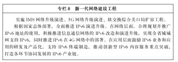 實(shí)施“寬帶龍江”戰(zhàn)略。加快新一代互聯(lián)網(wǎng)布局,打造全光纖網(wǎng)絡(luò)城市,推進(jìn)互聯(lián)網(wǎng)進(jìn)村入戶,提升信息網(wǎng)絡(luò)服務(wù)能力。實(shí)施寬帶網(wǎng)絡(luò)建設(shè)工程、新一代網(wǎng)絡(luò)建設(shè)工程和應(yīng)急保障工程,構(gòu)建高速寬帶、天地一體、泛在智能、安全可控、敏捷開放的新一代信息網(wǎng)絡(luò)。推進(jìn)提速降費(fèi),降低互聯(lián)網(wǎng)資費(fèi)水平,增加骨干網(wǎng)絡(luò)傳輸容量,提高寬帶接入速率。建設(shè)一批全光網(wǎng)城市,推進(jìn)網(wǎng)絡(luò)進(jìn)村入戶。消除寬帶網(wǎng)絡(luò)接入“最后一公里”瓶頸,進(jìn)一步推進(jìn)網(wǎng)絡(luò)提速降費(fèi)。加強(qiáng)信息基礎(chǔ)設(shè)施與市政、公路、鐵路、機(jī)場(chǎng)等規(guī)劃建設(shè)的銜接??茖W(xué)靈活選擇移動(dòng)蜂窩、衛(wèi)星通信等接入技術(shù),分類推進(jìn)農(nóng)村、邊遠(yuǎn)地區(qū)、林區(qū)的網(wǎng)絡(luò)覆蓋。