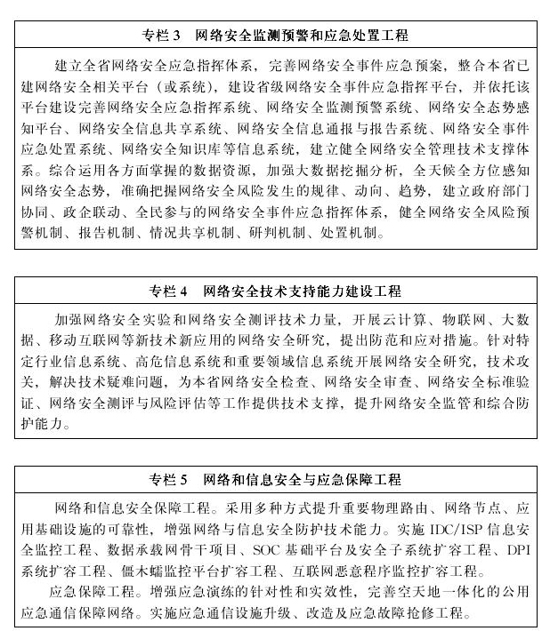 健全網(wǎng)絡(luò)安全保障體系。強(qiáng)化全省網(wǎng)絡(luò)安全頂層設(shè)計(jì),完善網(wǎng)絡(luò)安全制度體系,建立和完善網(wǎng)絡(luò)安全責(zé)任制、等級(jí)保護(hù)、安全審查、安全檢查、測(cè)評(píng)和風(fēng)險(xiǎn)評(píng)估等相關(guān)制度,健全網(wǎng)絡(luò)安全管理體制機(jī)制。建立完善省、市(地)、縣(市)網(wǎng)絡(luò)安全應(yīng)急管理體系、應(yīng)急指揮體系和應(yīng)急預(yù)案體系,建立統(tǒng)一高效的網(wǎng)絡(luò)安全風(fēng)險(xiǎn)報(bào)告、情報(bào)共享、研判、處置、網(wǎng)絡(luò)安全信息共享和通報(bào)、災(zāi)難備份機(jī)制,加快網(wǎng)絡(luò)安全基礎(chǔ)設(shè)施建設(shè),提高網(wǎng)絡(luò)安全態(tài)勢(shì)感知、監(jiān)測(cè)預(yù)警和網(wǎng)絡(luò)安全事件應(yīng)急處置能力。構(gòu)建關(guān)鍵信息基礎(chǔ)設(shè)施安全保障體系,提高金融、能源、水利、通信、交通、地理信息等領(lǐng)域關(guān)鍵信息基礎(chǔ)設(shè)施網(wǎng)絡(luò)安全防御能力。加大無(wú)線電安全管理和重要信息系統(tǒng)無(wú)線電頻率保障力度。建設(shè)完善密碼基礎(chǔ)設(shè)施,加強(qiáng)重要領(lǐng)域密碼應(yīng)用和安全監(jiān)管。完善網(wǎng)絡(luò)信任體系,規(guī)范身份認(rèn)證、電子簽名、授權(quán)管理、責(zé)任認(rèn)定等行為。推進(jìn)政務(wù)網(wǎng)絡(luò)整合與資源共享,提高電子政務(wù)網(wǎng)絡(luò)和各類政務(wù)信息系統(tǒng)安全防護(hù)水平。加強(qiáng)涉密信息系統(tǒng)保密防護(hù)監(jiān)管。健全網(wǎng)絡(luò)安全標(biāo)準(zhǔn)體系。加強(qiáng)網(wǎng)絡(luò)空間安全學(xué)科專業(yè)和院系建設(shè),培養(yǎng)我省急需的網(wǎng)絡(luò)安全人才。建立網(wǎng)絡(luò)安全領(lǐng)域的政產(chǎn)學(xué)研工作機(jī)制,支持網(wǎng)絡(luò)安全技術(shù)和產(chǎn)品研發(fā),培育和發(fā)展網(wǎng)絡(luò)安全產(chǎn)業(yè)。