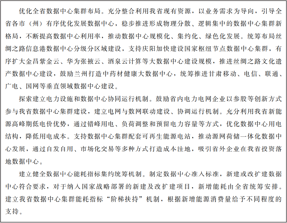 圍繞全國一體化算力網(wǎng)絡(luò)國家樞紐節(jié)點(diǎn)(甘肅)建設(shè),統(tǒng)籌優(yōu)化全省數(shù)據(jù)中心布局,引導(dǎo)傳統(tǒng)數(shù)據(jù)中心升級改造,向規(guī)模化、集約化、智能化、綠色化方向布局發(fā)展。探索建立電力設(shè)施和數(shù)據(jù)中心協(xié)同運(yùn)行機(jī)制、數(shù)據(jù)中心能耗指標(biāo)共享統(tǒng)籌機(jī)制。