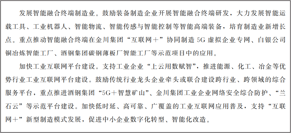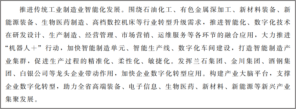圍繞沿黃河流域、河西走廊、隴東南三大產(chǎn)業(yè)聚集帶的空間布局,聚焦石化、能源、冶金、裝備制造等重點(diǎn)行業(yè),打造智能制造產(chǎn)業(yè)集群,全面提升企業(yè)數(shù)字化水平,形成智能制造為驅(qū)動(dòng)的新型工業(yè)體系。