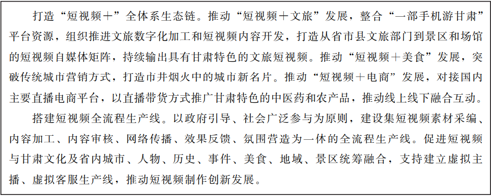 充分挖掘甘肅厚重的歷史文化旅游資源,在文化、旅游、民俗、美食、電商等領(lǐng)域與5G、短視頻、音頻、虛擬現(xiàn)實(shí)、在線直播等新技術(shù)業(yè)態(tài)相結(jié)合,引入短視頻服務(wù)類、音頻服務(wù)類、云服務(wù)類、電商類企業(yè),以數(shù)字內(nèi)容生產(chǎn)為抓手,打造“線上引流、線下轉(zhuǎn)型”的發(fā)展新模式,實(shí)現(xiàn)“一業(yè)帶百業(yè)”。