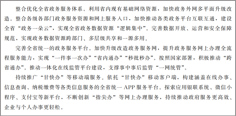 數(shù)字政務(wù)體系日趨完備。數(shù)字政務(wù)平臺建設(shè)取得長足發(fā)展,政務(wù)云及互聯(lián)網(wǎng)、政務(wù)專網(wǎng)等基礎(chǔ)設(shè)施建設(shè)初具規(guī)模。政務(wù)服務(wù)便利化程度顯著提升,建成“甘快辦”移動(dòng)端服務(wù)平臺,積極打造“掌上辦”“指尖辦”甘肅品牌。甘肅省涉企政策精準(zhǔn)推送和“不來即享”服務(wù)系統(tǒng)覆蓋全省41.8萬戶企業(yè),獲得國務(wù)院表彰。政務(wù)數(shù)據(jù)共享開放水平不斷提升,“數(shù)據(jù)共享負(fù)面清單”全面推行,省級數(shù)據(jù)共享交換平臺及政務(wù)信息共享網(wǎng)站建成投運(yùn),實(shí)現(xiàn)國家、省、市數(shù)據(jù)共享交換平臺級聯(lián)對接。