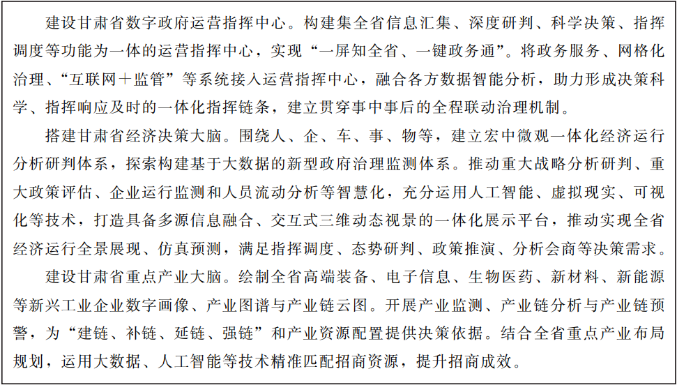 以數(shù)字政府建設(shè)為驅(qū)動(dòng),以城市規(guī)劃、建設(shè)、管理、服務(wù)數(shù)據(jù)為基本要素,運(yùn)用城市信息模型、虛擬仿真等技術(shù),搭建甘肅省數(shù)字政府運(yùn)營指揮中心,建設(shè)宏中微觀一體化經(jīng)濟(jì)決策大腦、產(chǎn)業(yè)大腦,培育數(shù)據(jù)驅(qū)動(dòng)、協(xié)同融合、共創(chuàng)共享的大數(shù)據(jù)應(yīng)用生態(tài)體系,支持全省重大決策。