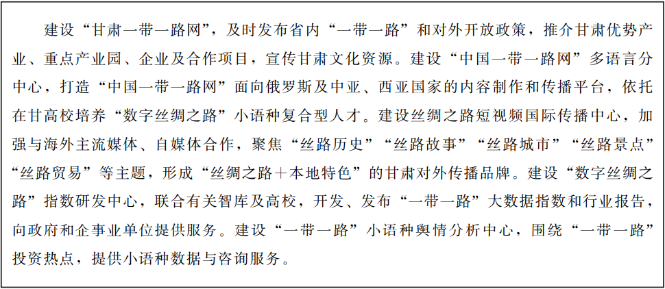 推進(jìn)海外數(shù)據(jù)在甘肅匯集、分析、落地應(yīng)用,加強(qiáng)同“一帶一路”沿線國家在數(shù)字化、網(wǎng)絡(luò)化、智能化方面的國際合作,促進(jìn)文化國際傳播交流,打造“數(shù)字絲綢之路”的重要門戶和核心節(jié)點(diǎn)。