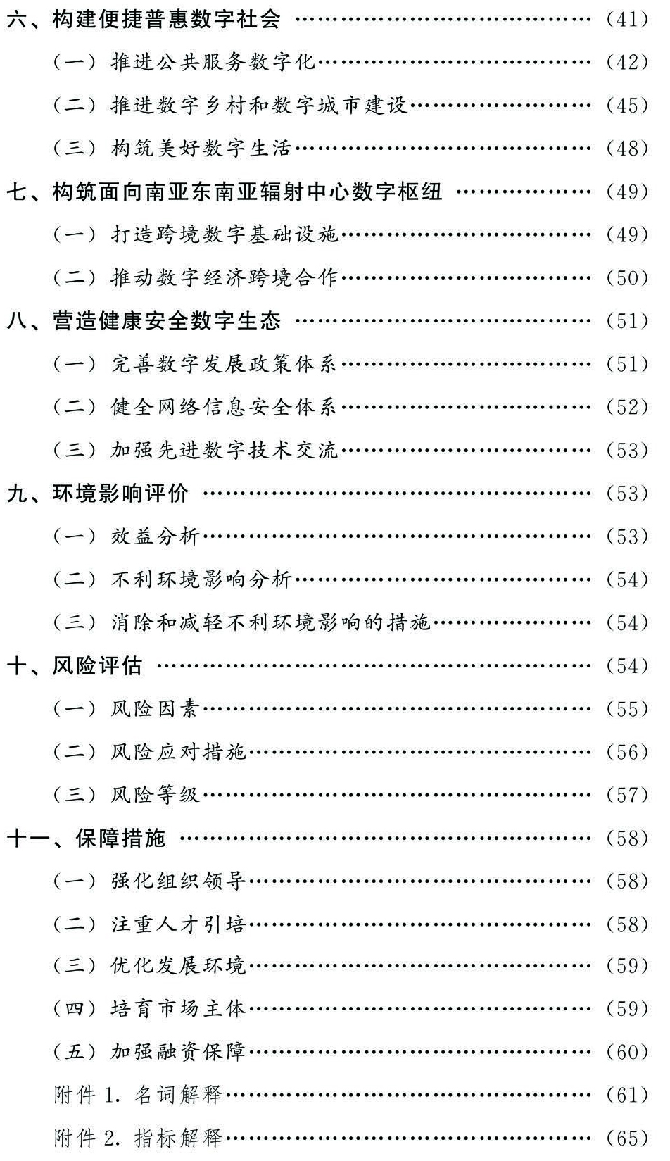 本規(guī)劃在建設(shè)數(shù)字基礎(chǔ)設(shè)施、發(fā)展數(shù)字經(jīng)濟(jì)、打造數(shù)字政府、發(fā)展數(shù)字社會(huì)、打造面向南亞東南亞輻射中心數(shù)字樞紐等方面具有良好的社會(huì)效益。規(guī)劃存在的社會(huì)穩(wěn)定、生態(tài)環(huán)境、法律糾紛、財(cái)政金融、技術(shù)安全、網(wǎng)絡(luò)和數(shù)據(jù)安全風(fēng)險(xiǎn)具有可控性。在充分落實(shí)前述風(fēng)險(xiǎn)應(yīng)對措施后,確定本規(guī)劃綜合風(fēng)險(xiǎn)等級為“低風(fēng)險(xiǎn)”。