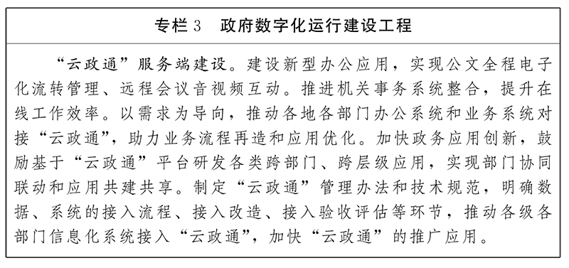 提升政務(wù)協(xié)同辦公數(shù)字化水平,構(gòu)建統(tǒng)一的政務(wù)協(xié)同辦公平臺“云政通”,支持各地各部門網(wǎng)上辦文、辦事,服務(wù)跨部門、跨層級遠(yuǎn)程辦會(huì),提供政務(wù)服務(wù)事項(xiàng)的集中處理、協(xié)同審批及統(tǒng)一效能監(jiān)管服務(wù)。提升決策指揮數(shù)字化水平,加快政務(wù)應(yīng)用創(chuàng)新,支持基于“云政通”平臺研發(fā)各類跨部門、跨層級應(yīng)用,實(shí)現(xiàn)部門協(xié)同聯(lián)動(dòng)和應(yīng)用共建共享。建立完善以匯聚數(shù)據(jù)為基礎(chǔ)的部門間數(shù)據(jù)共享應(yīng)用機(jī)制,建設(shè)政務(wù)數(shù)據(jù)共享交換平臺,大力推進(jìn)部門通過平臺獲取共享數(shù)據(jù),促進(jìn)業(yè)務(wù)協(xié)同和流程優(yōu)化,減少數(shù)據(jù)重復(fù)采集,減輕群眾和基層信息負(fù)擔(dān)。分級構(gòu)建決策指揮系統(tǒng),強(qiáng)化政府科學(xué)決策輔助能力,探索研發(fā)決策執(zhí)行模擬系統(tǒng),圍繞規(guī)劃布局、經(jīng)濟(jì)調(diào)控、應(yīng)急指揮等構(gòu)建分析模型,優(yōu)化決策的合理性和精準(zhǔn)性。提升行政監(jiān)督數(shù)字化水平,建設(shè)紀(jì)檢監(jiān)察、巡視巡察、行政執(zhí)法監(jiān)督、審計(jì)等問題整改動(dòng)態(tài)監(jiān)管平臺,推進(jìn)問題發(fā)現(xiàn)與整改的全過程閉環(huán)可控,實(shí)現(xiàn)行政行為全程留痕留印、風(fēng)險(xiǎn)可控和過往可溯。