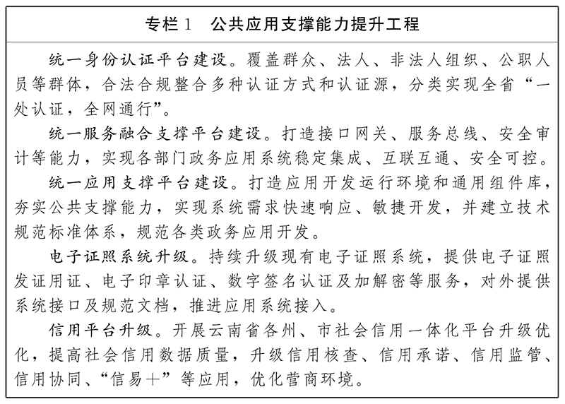 建設(shè)統(tǒng)一身份認(rèn)證平臺、統(tǒng)一服務(wù)融合支撐平臺、統(tǒng)一應(yīng)用支撐平臺,強(qiáng)化對各類應(yīng)用支撐和對接力度,提升政務(wù)信息系統(tǒng)協(xié)同和開發(fā)能力。省直有關(guān)部門現(xiàn)有政務(wù)系統(tǒng),經(jīng)技術(shù)改造后接入相關(guān)平臺,新建系統(tǒng)按照統(tǒng)一數(shù)據(jù)、業(yè)務(wù)接口標(biāo)準(zhǔn)接入,鼓勵(lì)州市級政務(wù)系統(tǒng)接入。省級統(tǒng)一部署人工智能、政務(wù)區(qū)塊鏈等基礎(chǔ)平臺,提供智能化工具、底鏈支撐及感知數(shù)據(jù)整合。各地各部門原則上不再單獨(dú)建設(shè)公共支撐平臺。
