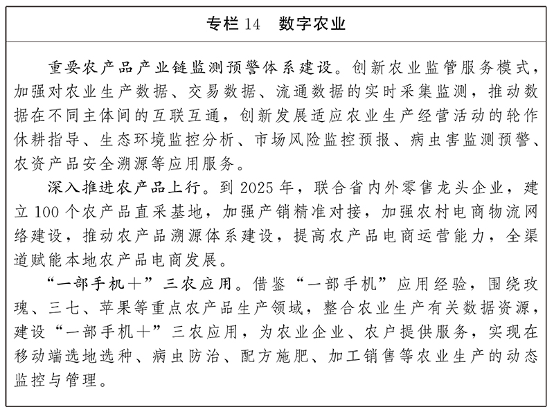 引導(dǎo)數(shù)字技術(shù)在農(nóng)業(yè)生產(chǎn)全過程的廣泛應(yīng)用,推進(jìn)農(nóng)業(yè)土壤、氣候、產(chǎn)業(yè)分布等各類數(shù)據(jù)在一張圖上疊加,實(shí)現(xiàn)農(nóng)產(chǎn)品的全生命周期數(shù)據(jù)共享。鼓勵(lì)企業(yè)發(fā)展茶葉、花卉、水果、蔬菜、堅(jiān)果、咖啡、中藥材、肉牛等數(shù)字化農(nóng)業(yè)特色應(yīng)用,建設(shè)一批農(nóng)業(yè)農(nóng)村信息化示范基地、智慧農(nóng)業(yè)產(chǎn)業(yè)園區(qū)、智慧農(nóng)場、農(nóng)業(yè)智慧物流配送中心等。大力發(fā)展農(nóng)村電商,建立綠色農(nóng)產(chǎn)品線上銷售、供應(yīng)鏈協(xié)同、防偽追溯等體系,推動(dòng)種植、養(yǎng)殖、采購、銷售到追溯全鏈條數(shù)字化升級,全面提升農(nóng)業(yè)生產(chǎn)、加工、銷售各環(huán)節(jié)附加值。支持企業(yè)創(chuàng)新合作模式,補(bǔ)齊農(nóng)戶使用數(shù)字技術(shù)短板,持續(xù)拓展農(nóng)產(chǎn)品銷售市場,充分挖掘農(nóng)產(chǎn)品價(jià)值,帶動(dòng)農(nóng)民增收致富。