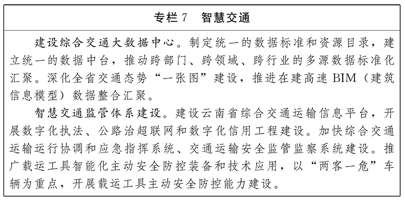 打造智慧交通綜合管理體系。推動(dòng)交通基礎(chǔ)設(shè)施與交通感知網(wǎng)絡(luò)、通信網(wǎng)絡(luò)同步建設(shè),推進(jìn)高速公路、機(jī)場、車站等智慧化改造。打造綜合交通運(yùn)輸運(yùn)行協(xié)調(diào)和應(yīng)急指揮體系,與公路經(jīng)營管理單位通信指揮系統(tǒng)、路政應(yīng)急處置系統(tǒng)、公安交警指揮調(diào)度系統(tǒng)的對接,實(shí)現(xiàn)“一路多方”的交通運(yùn)行監(jiān)測和應(yīng)急協(xié)同應(yīng)用,推動(dòng)交通智能化應(yīng)急指揮體系閉環(huán)運(yùn)行。試點(diǎn)客運(yùn)電子票證、貨運(yùn)“一單制”等,持續(xù)優(yōu)化數(shù)字交通服務(wù)能力。積極開展車聯(lián)網(wǎng)、車路協(xié)同和無人駕駛等技術(shù)創(chuàng)新試點(diǎn)。推動(dòng)昆明智慧交通區(qū)域輻射示范、保山城鄉(xiāng)一體化智慧交通體系示范、玉溪國家電子車牌試點(diǎn)城市等建設(shè),引領(lǐng)全省智慧交通快速發(fā)展。