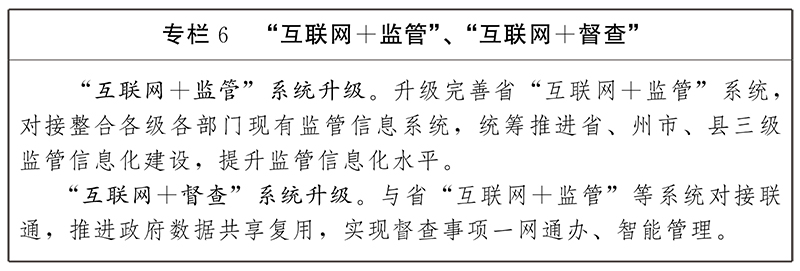 推進(jìn)“互聯(lián)網(wǎng)+監(jiān)管”建設(shè)。升級完善省“互聯(lián)網(wǎng)+監(jiān)管”系統(tǒng),建立健全監(jiān)管履職評估評價(jià)體系,實(shí)現(xiàn)監(jiān)管對象全覆蓋、監(jiān)管過程全記錄、監(jiān)管數(shù)據(jù)可共享可分析可預(yù)警,推動(dòng)事中事后監(jiān)管標(biāo)準(zhǔn)化、規(guī)范化、精準(zhǔn)化。建立全省統(tǒng)一的執(zhí)法信息公示平臺,依法公開行政執(zhí)法職責(zé)、依據(jù)、程序、結(jié)果等,接受社會(huì)監(jiān)督。