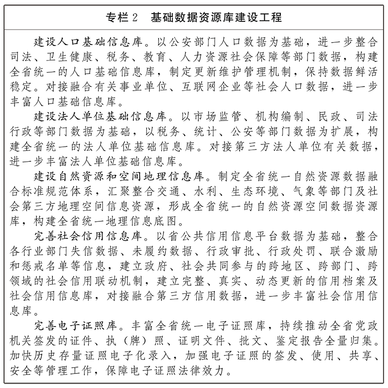 加快構(gòu)建并完善人口、法人、自然資源和空間地理、社會(huì)信用信息庫、電子證照庫等基礎(chǔ)庫以及各地各部門業(yè)務(wù)主題庫和有關(guān)專題庫,動(dòng)態(tài)更新、疊加、關(guān)聯(lián)數(shù)據(jù),形成多維度的人、事、物信息體系。加快完善可信數(shù)據(jù)共享交換體系,建設(shè)統(tǒng)一的政務(wù)數(shù)據(jù)共享交換平臺、數(shù)據(jù)資源目錄,省直各部門已建、新建非涉密系統(tǒng)采用數(shù)據(jù)接口方式接入平臺,加快各類政務(wù)數(shù)據(jù)共享。建立全省統(tǒng)一數(shù)據(jù)標(biāo)準(zhǔn)和重點(diǎn)行業(yè)數(shù)據(jù)標(biāo)準(zhǔn),為數(shù)據(jù)治理、數(shù)據(jù)管理、數(shù)據(jù)分析等提供依據(jù)。落實(shí)數(shù)據(jù)質(zhì)量保障責(zé)任,建立數(shù)據(jù)質(zhì)量管理閉環(huán)。根據(jù)部門職責(zé)按需依法依規(guī)使用共享數(shù)據(jù),加強(qiáng)共享數(shù)據(jù)使用全過程管理。編制政務(wù)數(shù)據(jù)開放目錄,建設(shè)統(tǒng)一的政務(wù)數(shù)據(jù)開放平臺,向社會(huì)提供開放政務(wù)數(shù)據(jù)的查詢、下載、應(yīng)用接口等服務(wù),開展創(chuàng)新應(yīng)用。