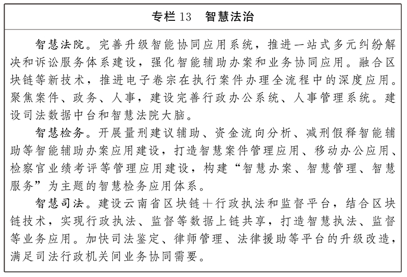 深化政法跨部門信息化執(zhí)法協(xié)作建設(shè),推進(jìn)偵察、逮捕、起訴、審判、執(zhí)行、法律援助等協(xié)同應(yīng)用。加快智慧法院建設(shè),提升辦案全周期溯源管理能力,搭建訴訟服務(wù)、執(zhí)行指揮、辦公辦案數(shù)字化體系,探索“云上物證室”等區(qū)塊鏈司法應(yīng)用。推進(jìn)智慧檢務(wù)應(yīng)用創(chuàng)新,探索數(shù)字卷宗單軌制協(xié)同辦案模式,開展量刑建議輔助、刑事執(zhí)行檢察智能輔助等辦公辦案應(yīng)用。發(fā)展智慧司法,推進(jìn)智慧執(zhí)法監(jiān)督、智慧公證、智慧調(diào)解、智慧司鑒等智能化應(yīng)用體系建設(shè),提升依法治省、行政立法、行政執(zhí)法監(jiān)督、刑事執(zhí)行與應(yīng)急指揮、公共法律服務(wù)等綜合服務(wù)能力。