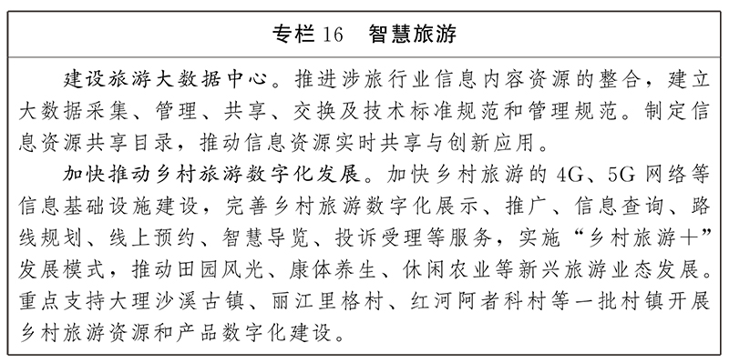 持續(xù)深化智慧旅游發(fā)展。持續(xù)優(yōu)化升級“一部手機(jī)游云南”,推進(jìn)文化和旅游綜合性服務(wù)體系建設(shè)。加快智慧旅游信息基礎(chǔ)設(shè)施建設(shè),在全省3A級以上旅游景區(qū)、星級賓館、旅游集中區(qū)、州市級公共文化服務(wù)場所實(shí)現(xiàn)智能導(dǎo)游、電子講解、刷臉認(rèn)證等服務(wù)全覆蓋,加快重點(diǎn)旅游核心區(qū)5G部署,打造“5G+智慧旅游”應(yīng)用。以大理古城、麗江古城、玉龍雪山等為重點(diǎn),打造全國智慧旅游景區(qū)樣板。打造租車、包車等智慧旅游交通出行服務(wù),打通景區(qū)交通“最后一公里”,推動(dòng)省內(nèi)各大交通樞紐到重點(diǎn)旅游城市、景區(qū)的無縫對接、零距離換乘和高效接駁。加快建立智慧旅游標(biāo)準(zhǔn)體系和統(tǒng)計(jì)體系,搭建文化和旅游可視化綜合管理體系,實(shí)現(xiàn)市場綜合執(zhí)法、市場主體信用建設(shè)、游客投訴受理與處置等數(shù)字化服務(wù)管理。