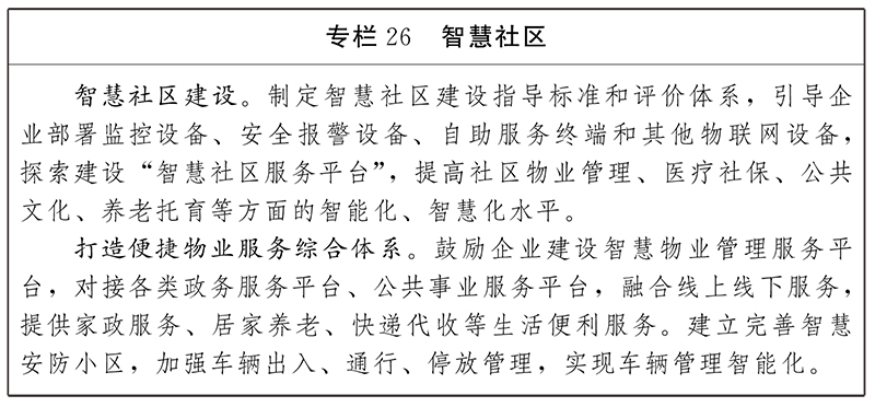 創(chuàng)新智慧社區(qū)服務(wù)。在有條件的社區(qū)開展網(wǎng)絡(luò)設(shè)施、智能終端等建設(shè),深化社區(qū)網(wǎng)格化數(shù)字管理模式應(yīng)用,持續(xù)完善在線矛盾糾紛多元化解平臺,有效提升基層矛盾化解能力。鼓勵(lì)社區(qū)服務(wù)企業(yè)打造便捷物業(yè)服務(wù)綜合體系,推動(dòng)物業(yè)管理、家政服務(wù)等應(yīng)用創(chuàng)新,發(fā)展社區(qū)智慧養(yǎng)老托育等服務(wù)。打通物流配送“最后一公里”,發(fā)展快遞自提點(diǎn)、快遞超市、智能快遞箱等服務(wù)。