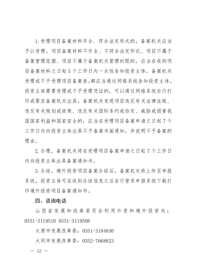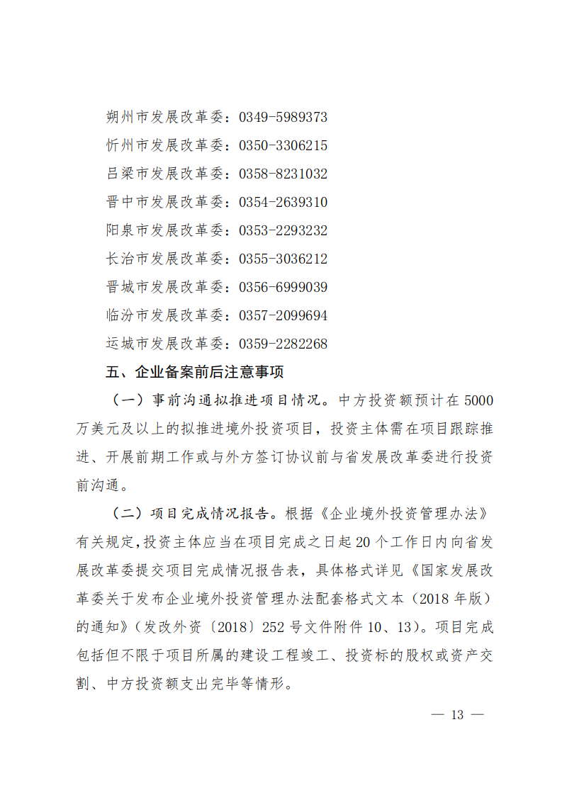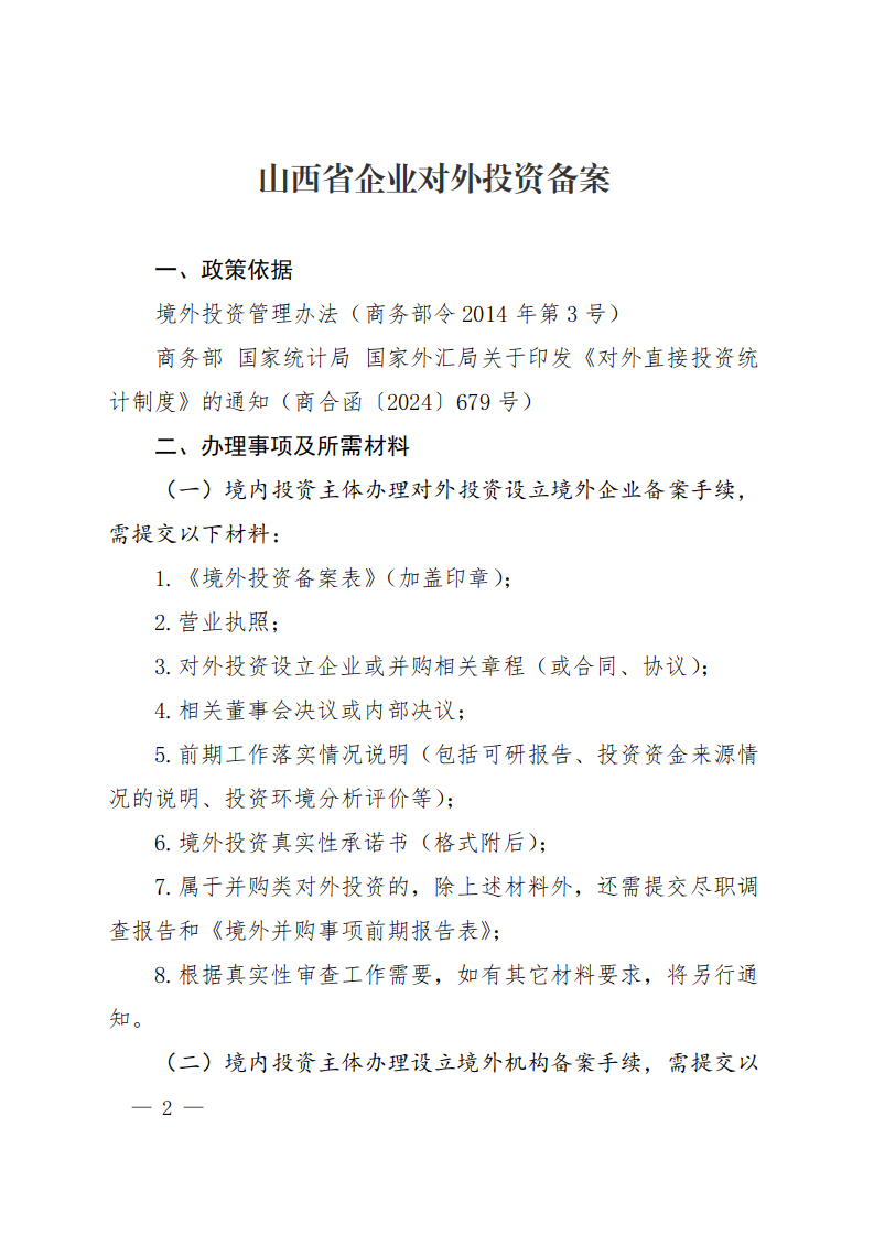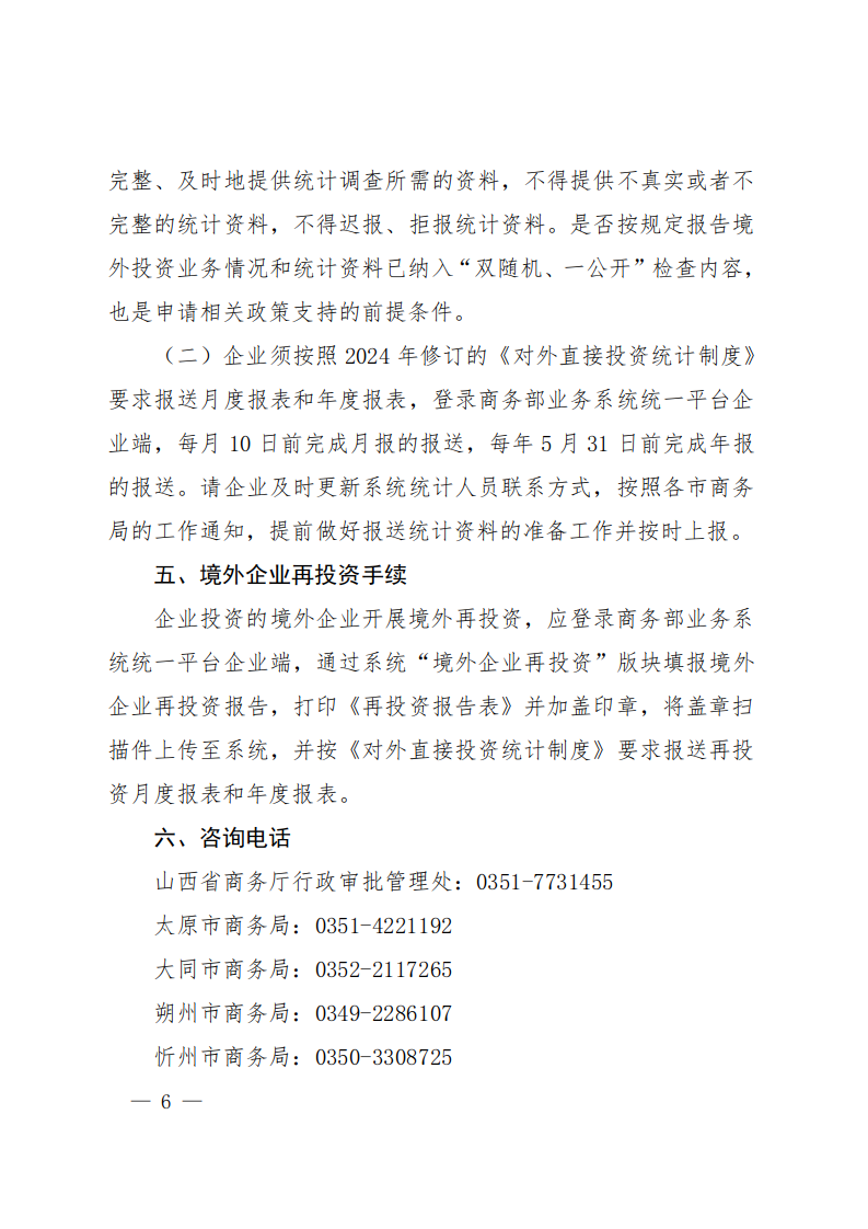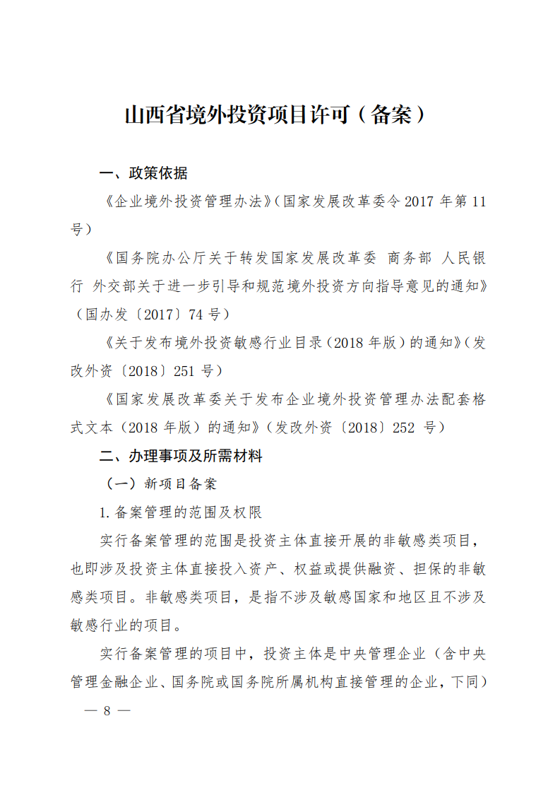 為促進我省對外投資合作有序發(fā)展,加強部門間聯(lián)動管理,進一步完善對外投資管理制度,更好地服務全省企業(yè)“走出去”工作,山西省商務廳、山西省發(fā)展和改革委員會、國家外匯管理局山西省分局聯(lián)合制定了《山西省境外投資指引》,現(xiàn)予印發(fā),請貫徹執(zhí)行。