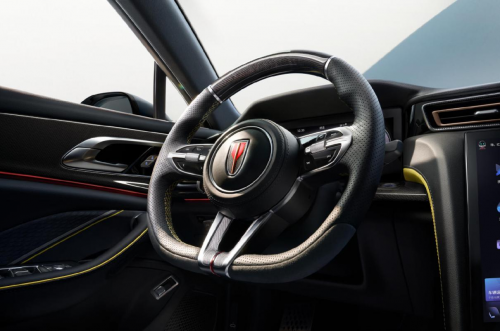 碳纖維加真皮材質(zhì)的平底式方向盤,在釋放腿部空間的同時,也使得視覺中心上移,讓駕駛者更專注于駕駛。六點鐘位置輻條的紋理設(shè)計,細節(jié)之處見真章。